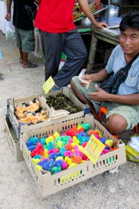 I wandered across the road to the market to see what I could find to drink. I was surprised when I walked past a man selling ducklings and chicks. Not because of what he was selling but because, in addition to yellow, they were red, green, blue, pink, purple and orange.