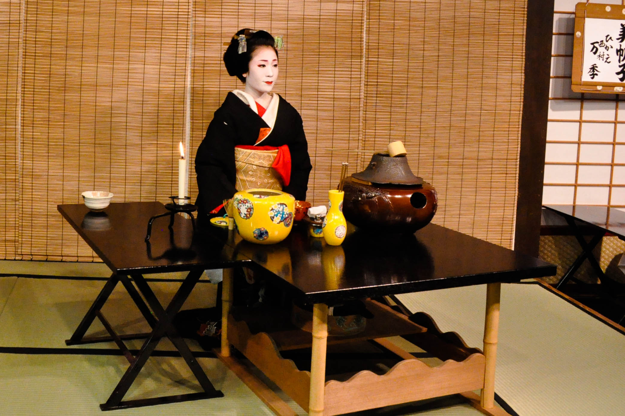 stage. One performing the tea ceremony, the other sitting and looking very pretty. En masse tea ceremony. It was really meant as a performance, rather than something to be participated in. But I still got to see real geisha performing a real tea ceremony in Japan in Gion district.