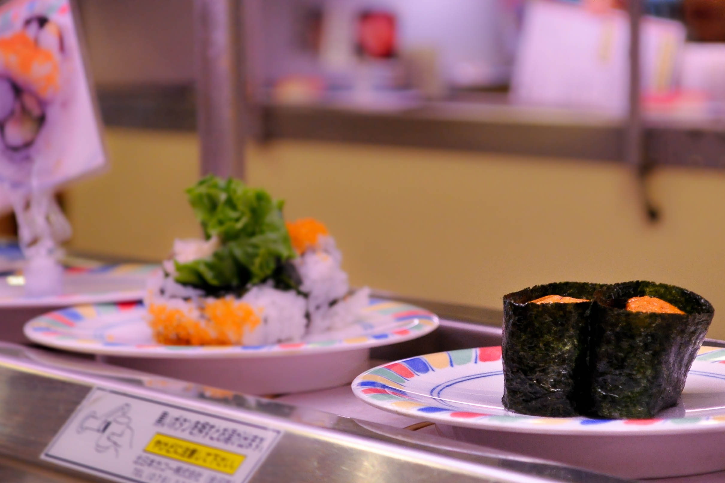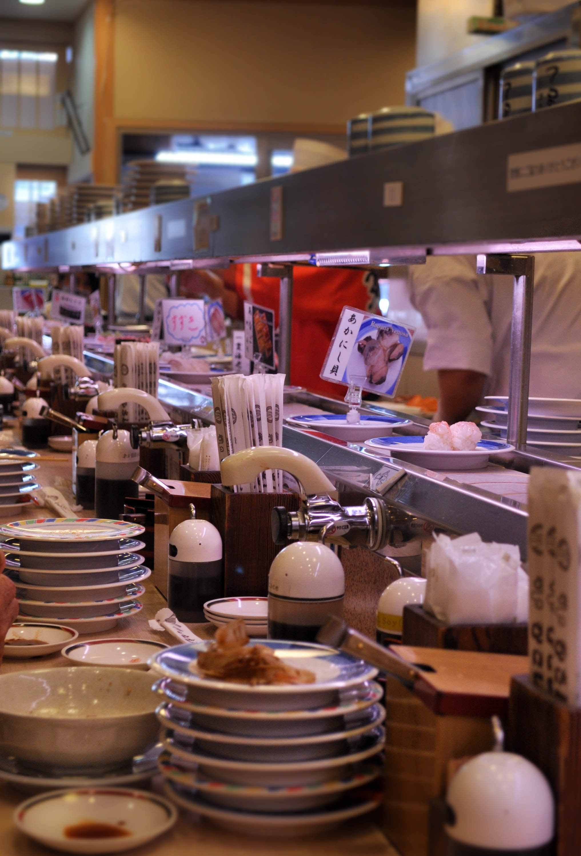 Which is ranked #4 out of more than 2,300 restaurants in Kyoto. Not sushi restaurants. All restaurants. My personal opinion? It very much deserves that ranking. If you are not in the know about conveyor belt sushi, let me fill you in. It’s brilliant. A sushi chef prepares the food and places it (usually two pieces, but sometimes one) on a small plate and then sends it on its way around the room on a conveyor belt.