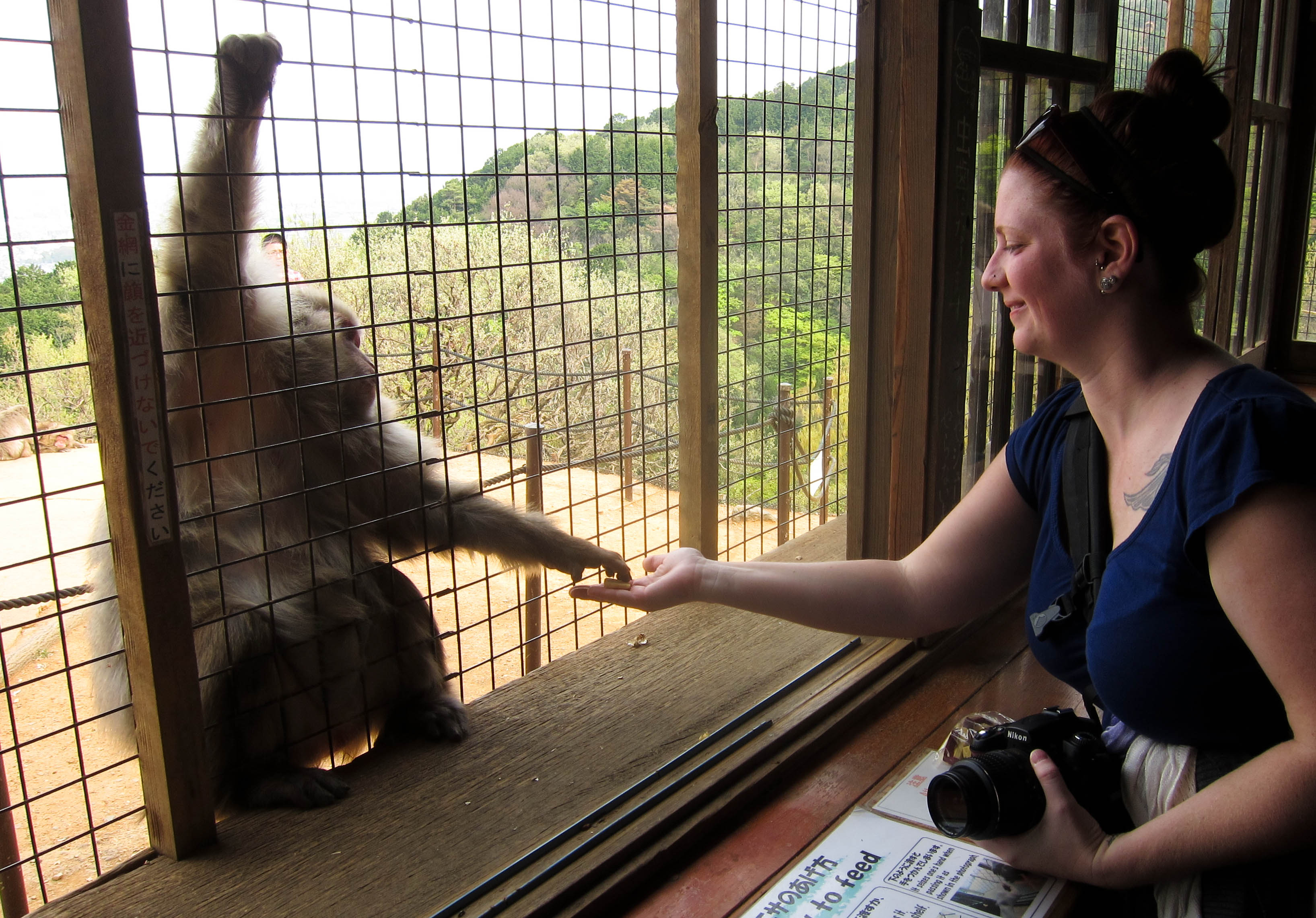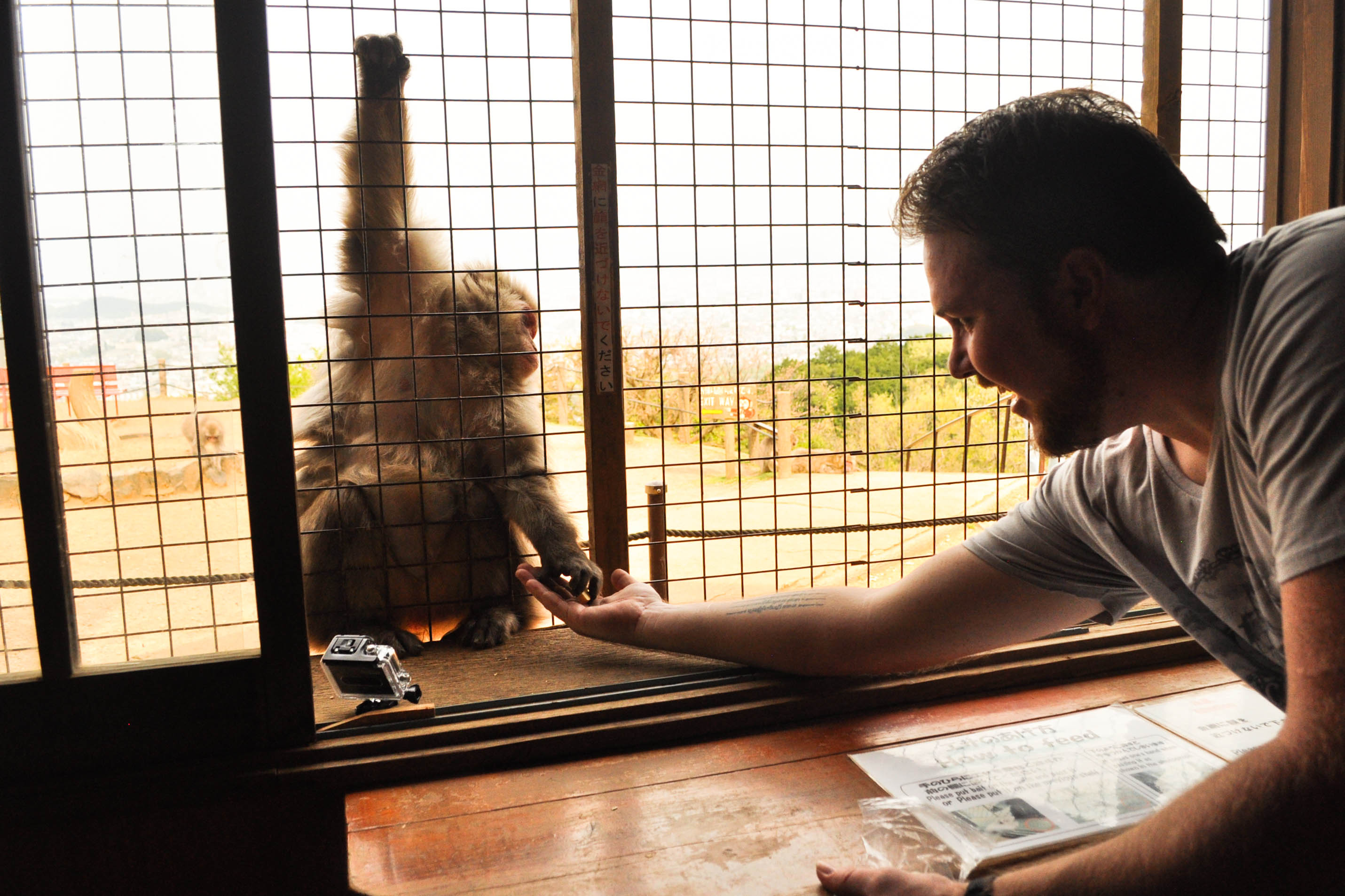 If you do desire to feed the monkeys, you can do so from the safety of the rest house. You enter through a door guarded by a man who is posted to make sure the monkeys don’t sneak in. For 100 yen you can purchase apples and peanuts. Three sides out) for you to give them food. And then they gently took the apples or peanuts from your hand. My faith in monkeys has been restored.