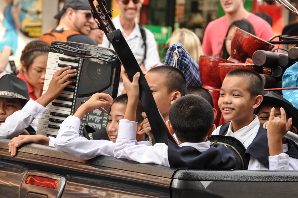 bangkok, children, happy, joy, joyful, khao san road, merriment, musicians, people watching, thailand, traveling band